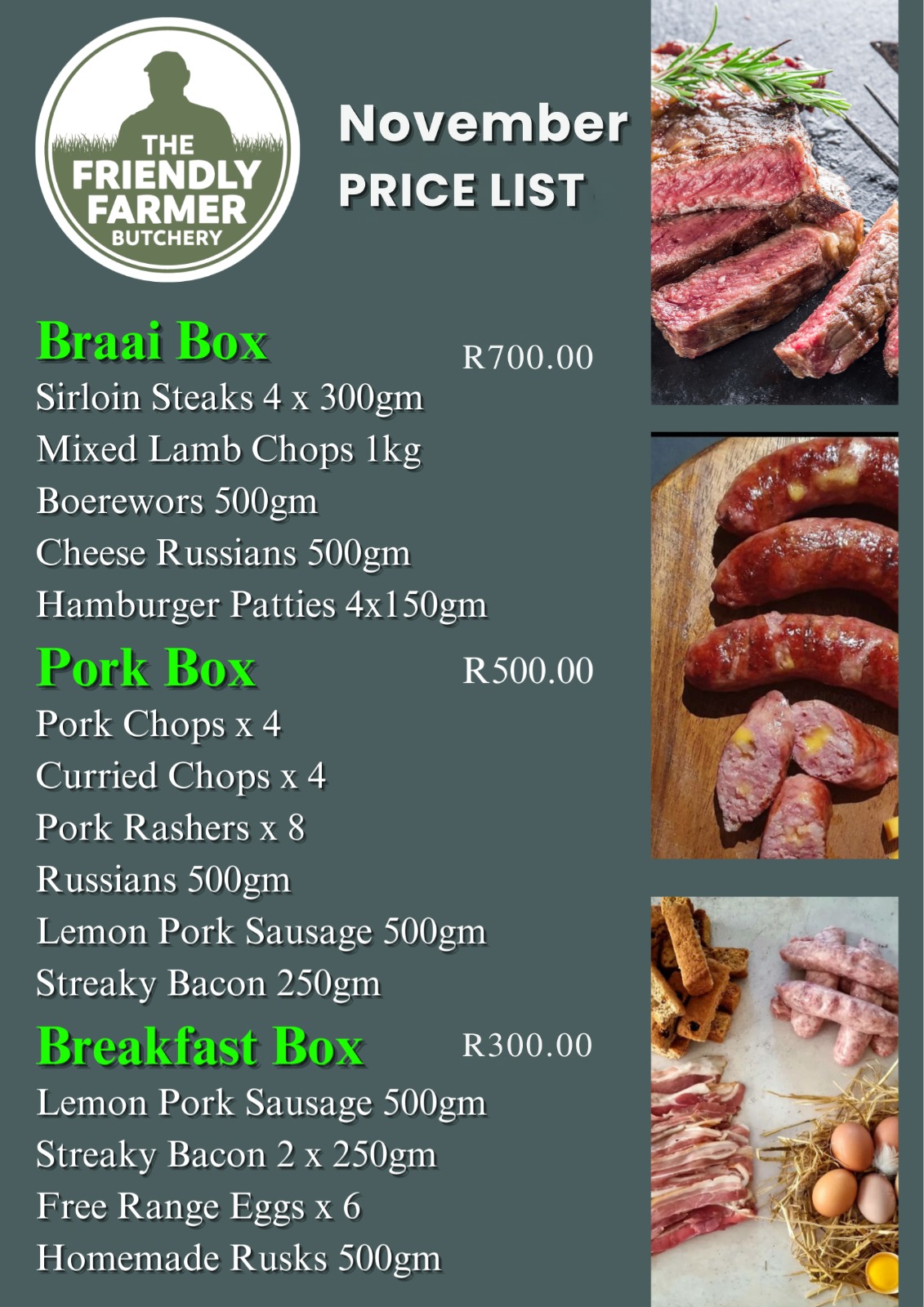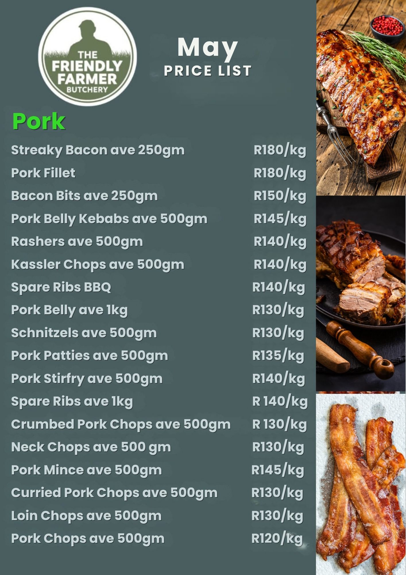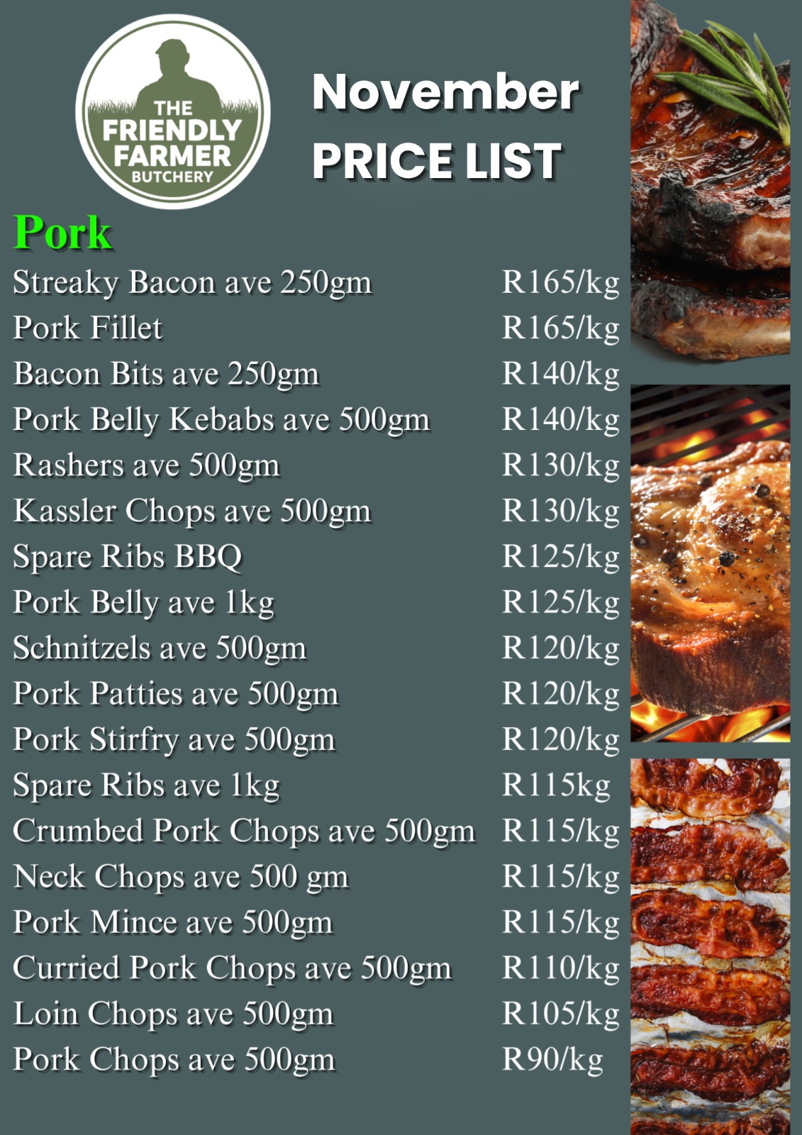 Pork Schnitzels, Rashers, Pork Belly, Cheese Russians, Loin Chops, Curried Pork Chops, Russian Boerewors, Lemon Pork Sausages